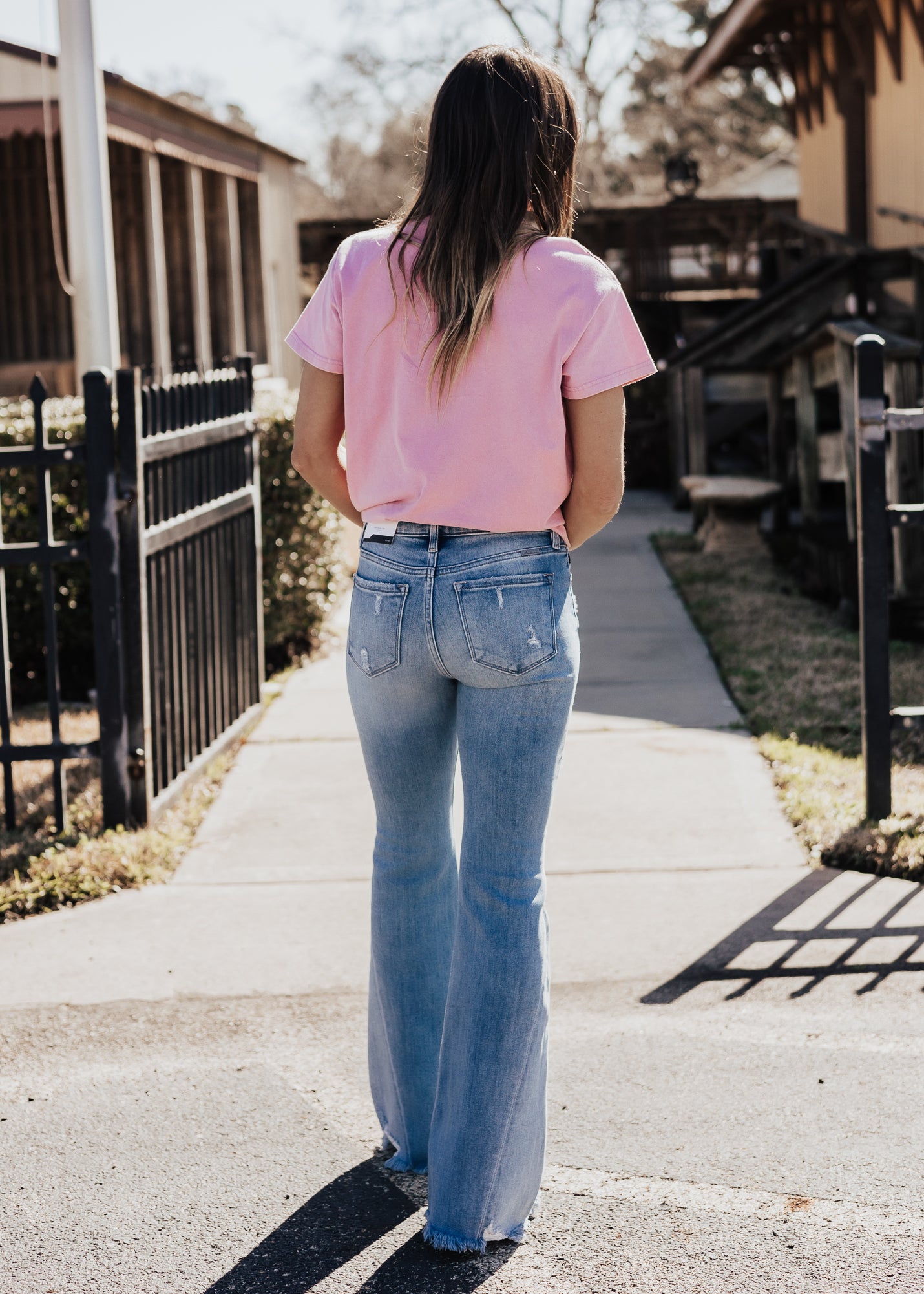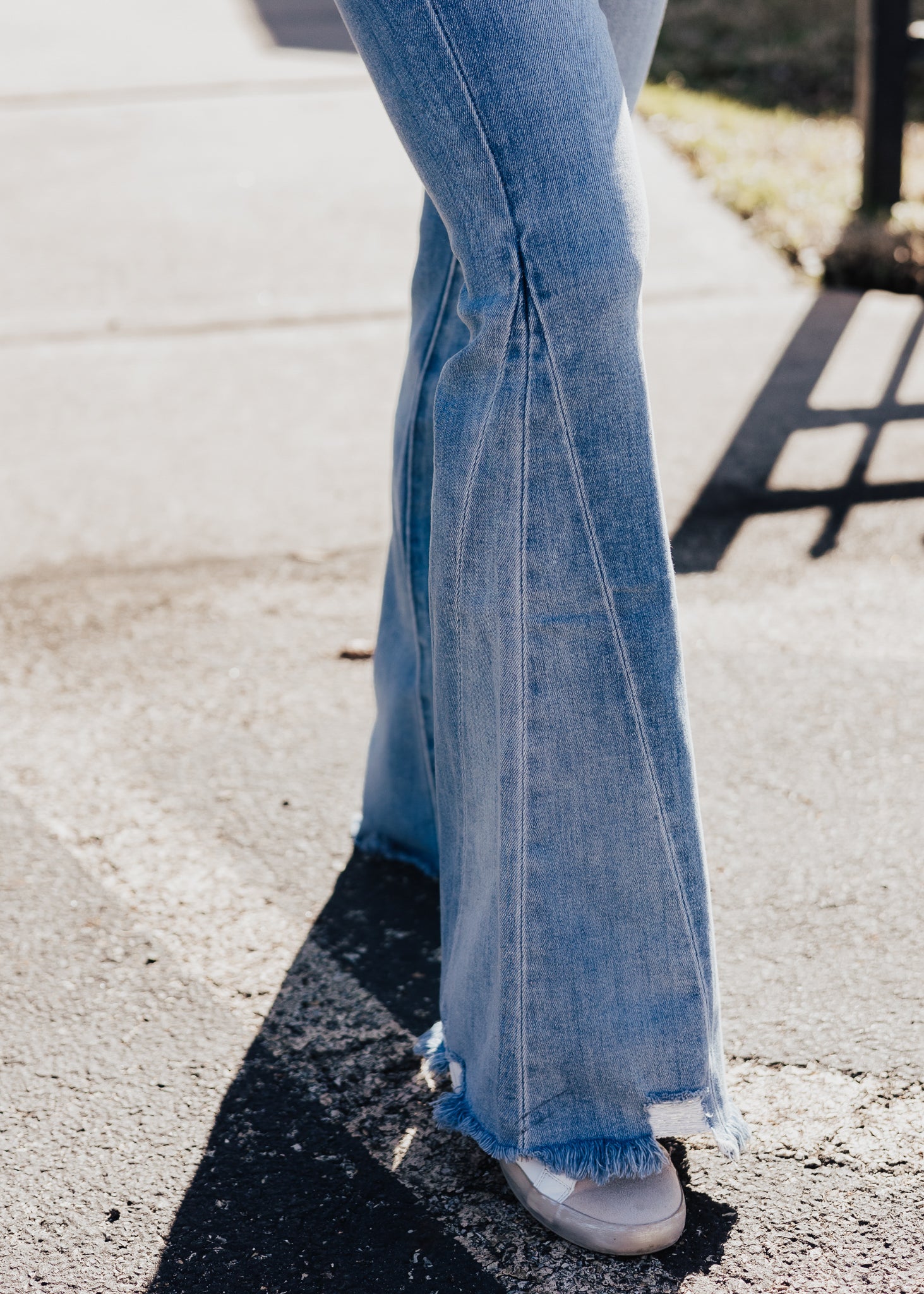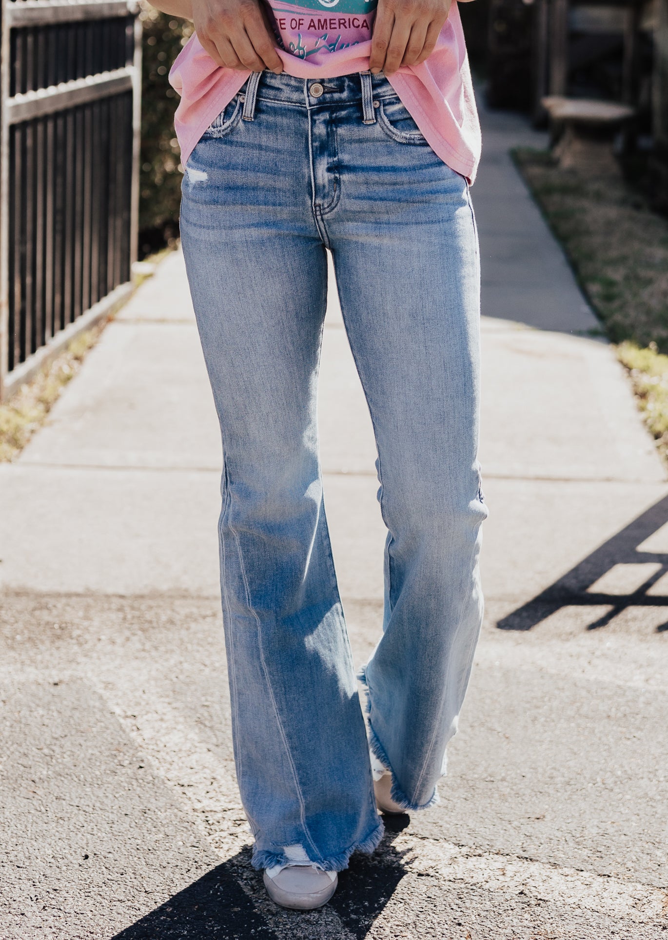 These do have stretch. Light distressing. Mid rise. Flare bottom. Fray.