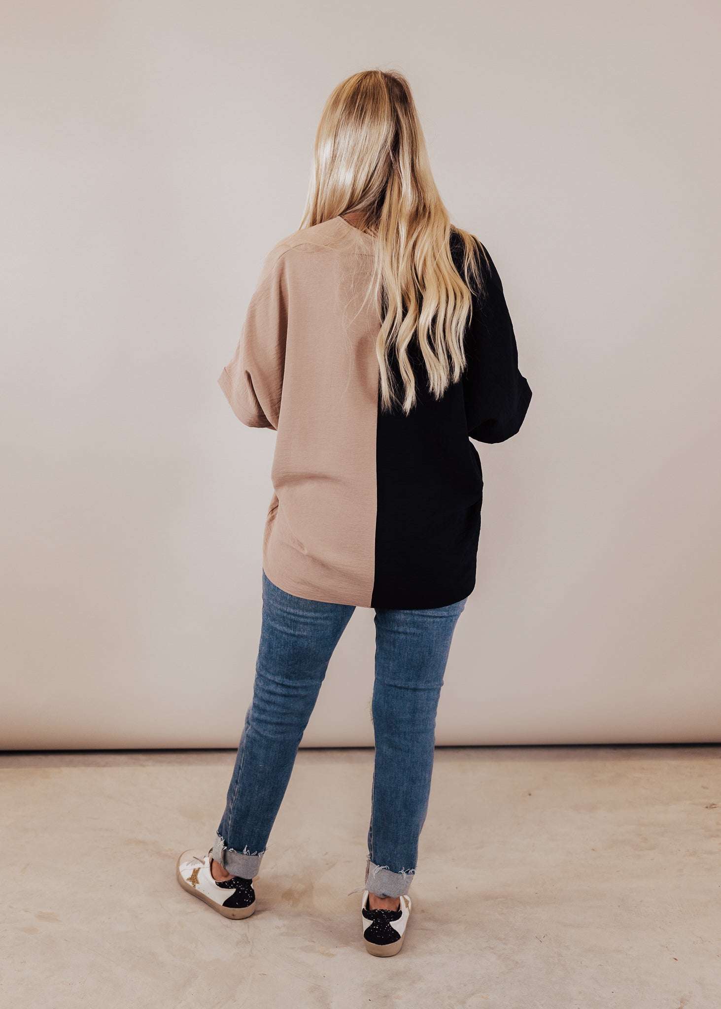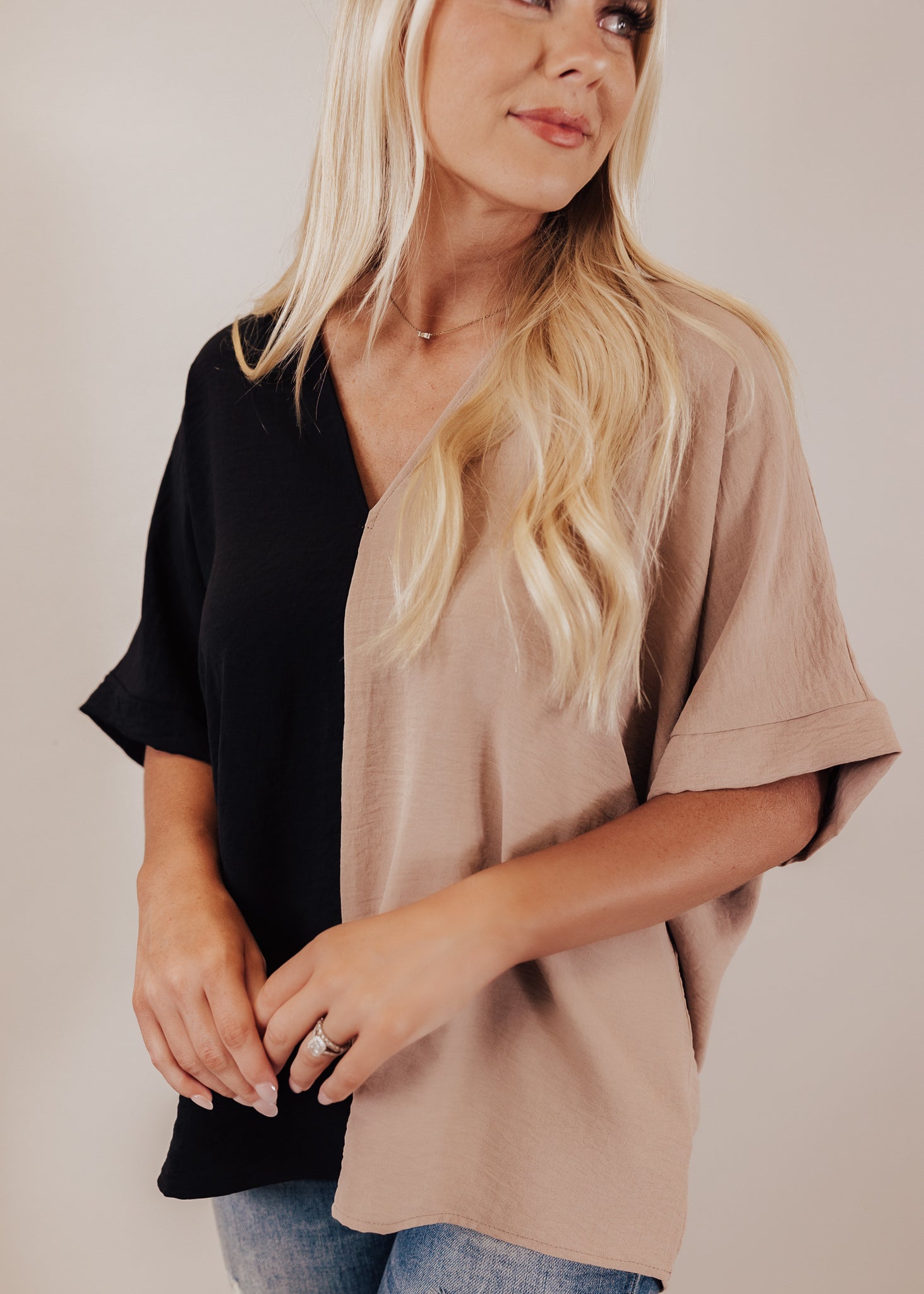 Color block top. V-neck, dolman short sleeve. Crinkle fabric.