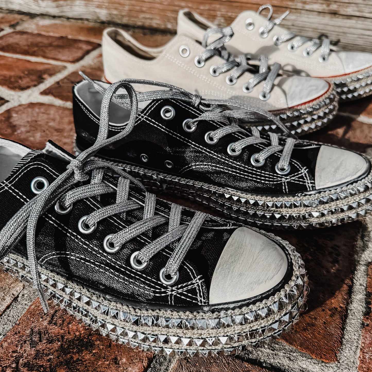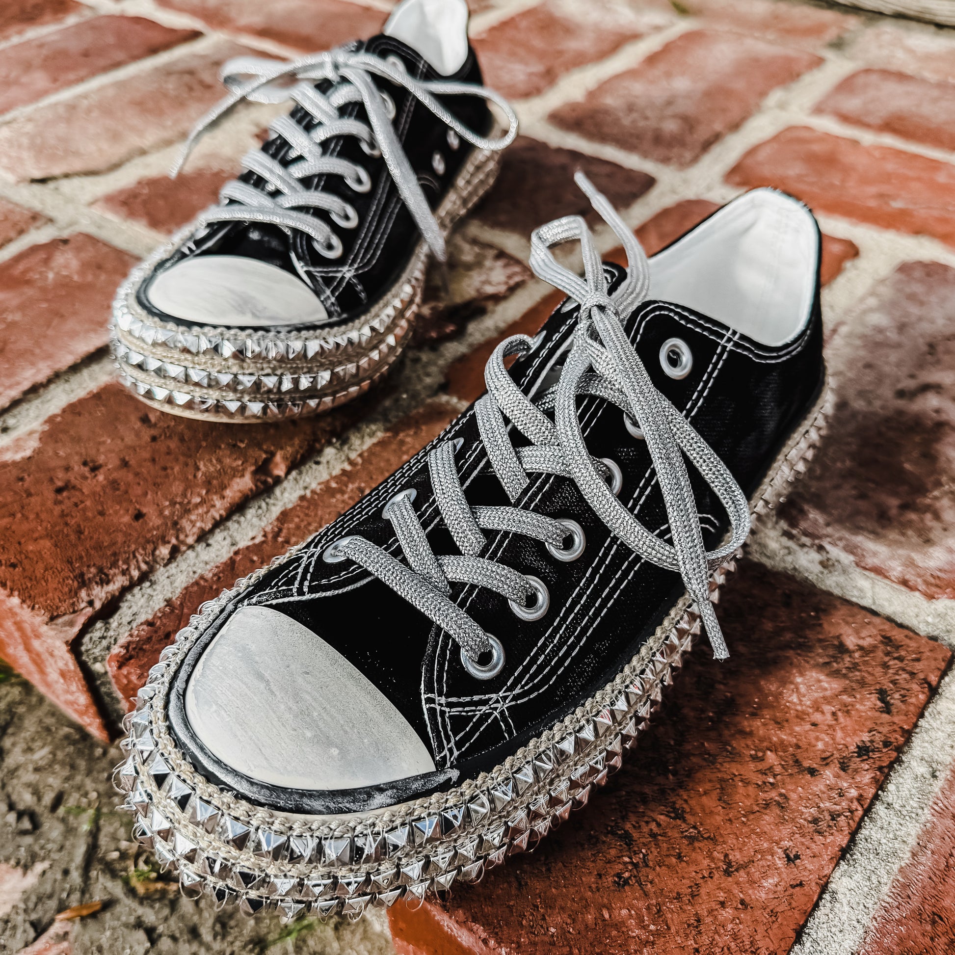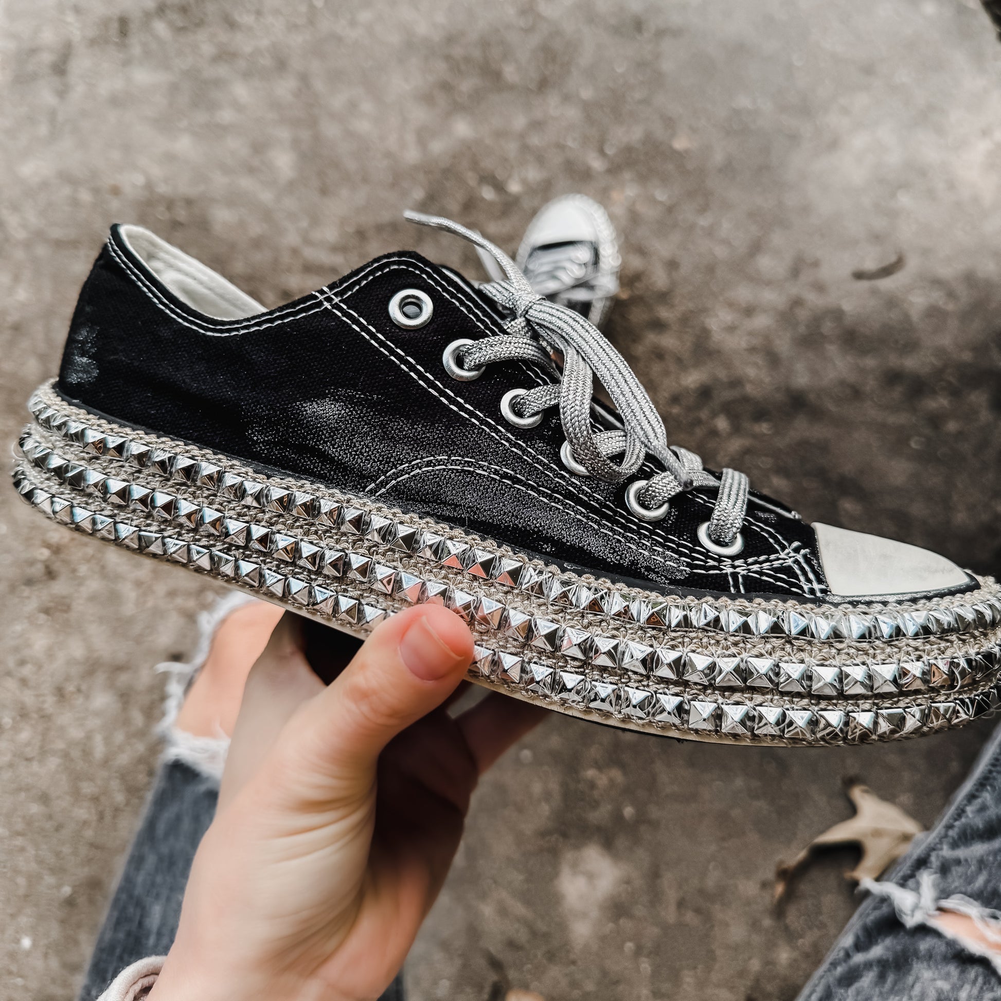 These have an edgy smudged worn look. Silver Laces. Silver faux stud covered espadrille.
