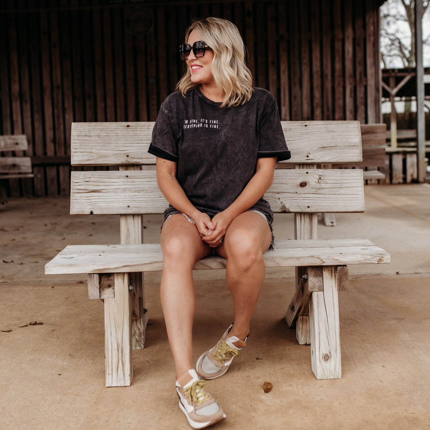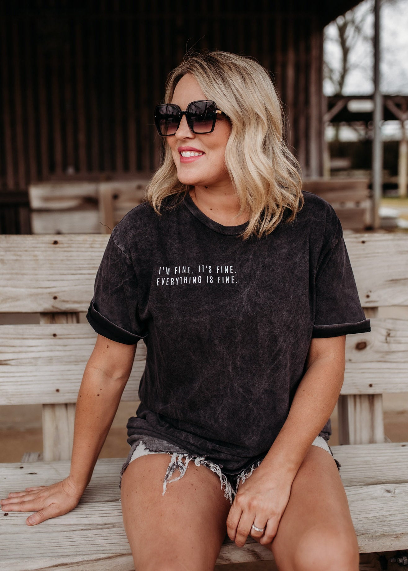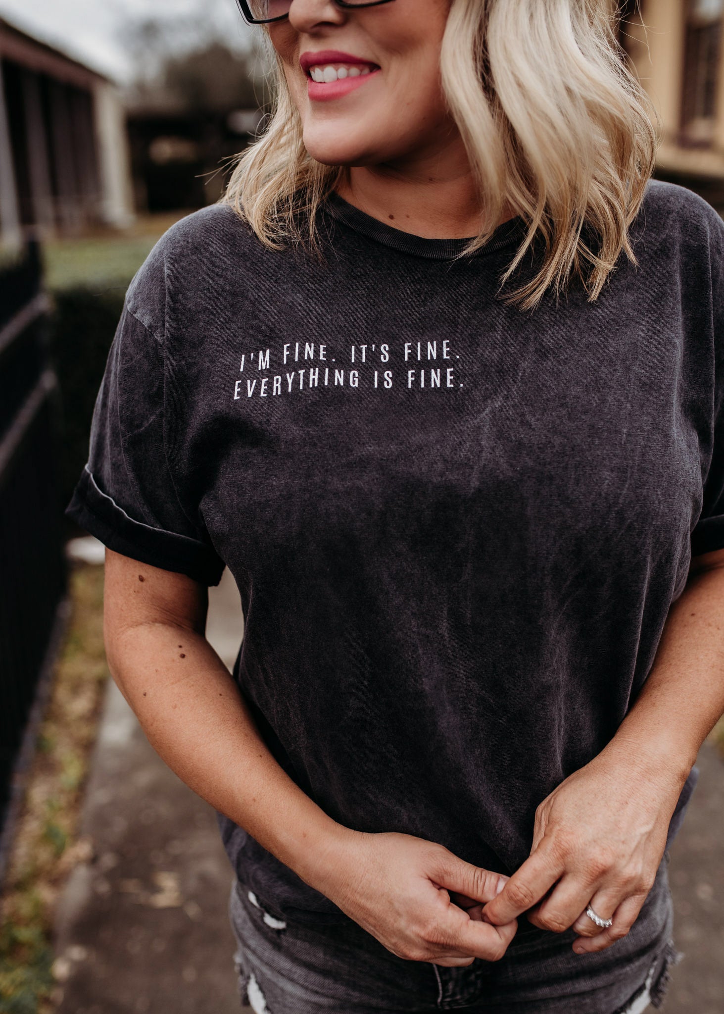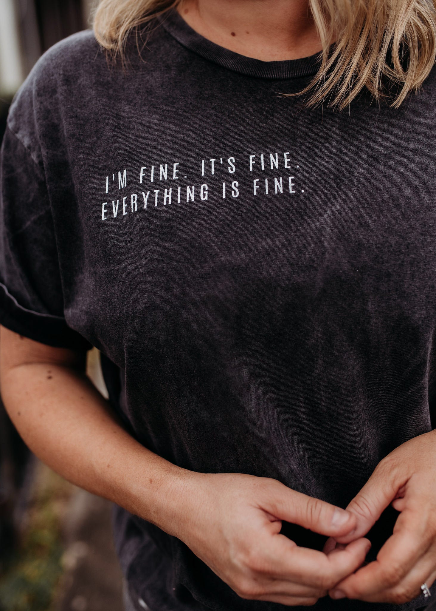 "I'm fine. It's Fine. Everything is fine." screen printed on a Vintage Black colored tee with white ink