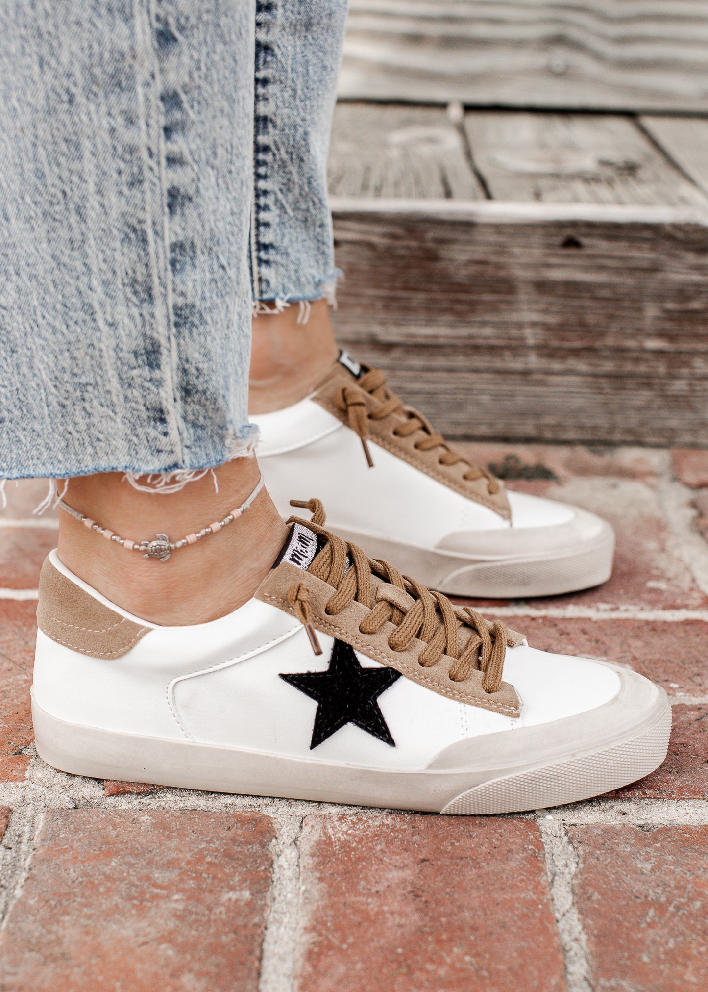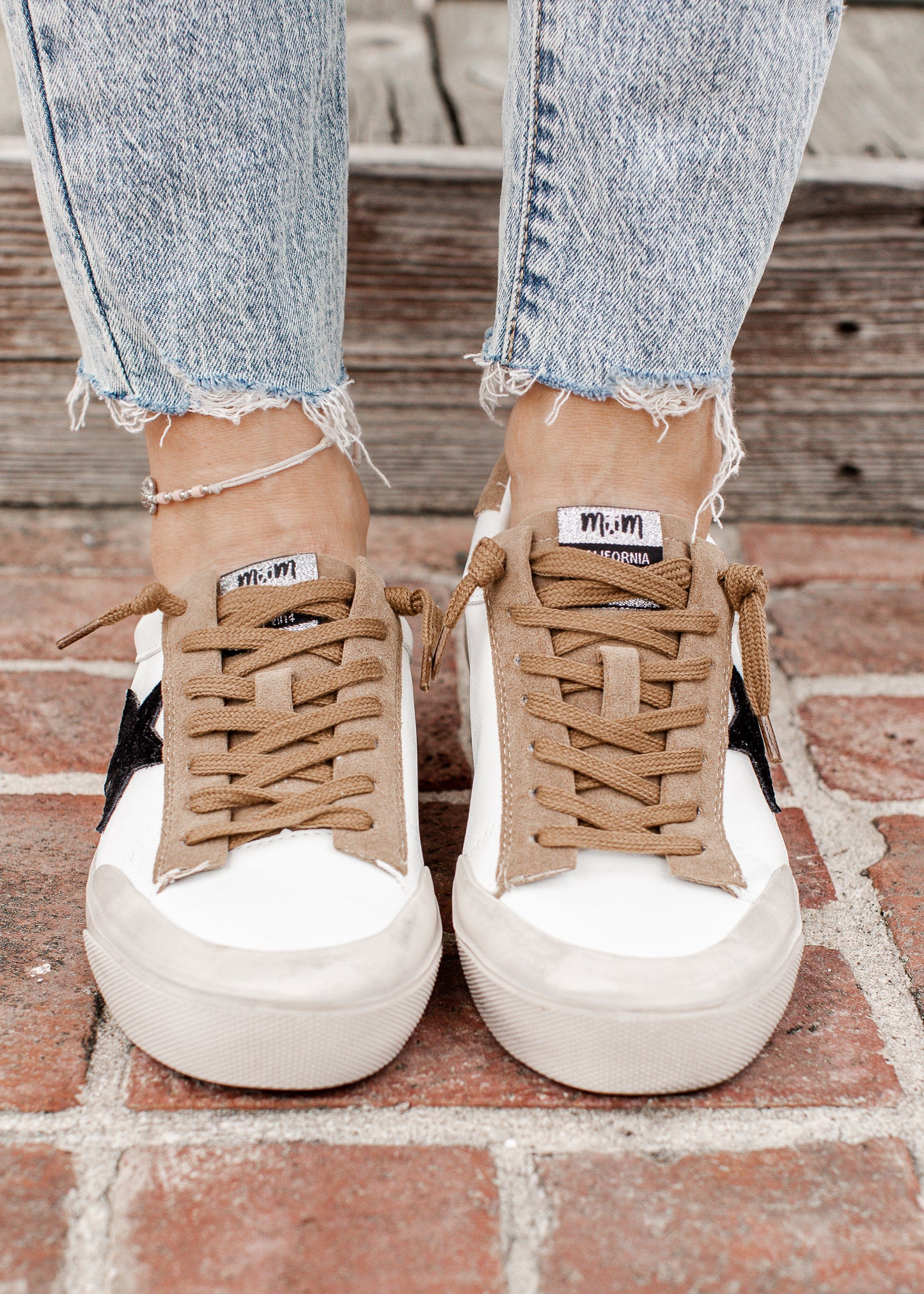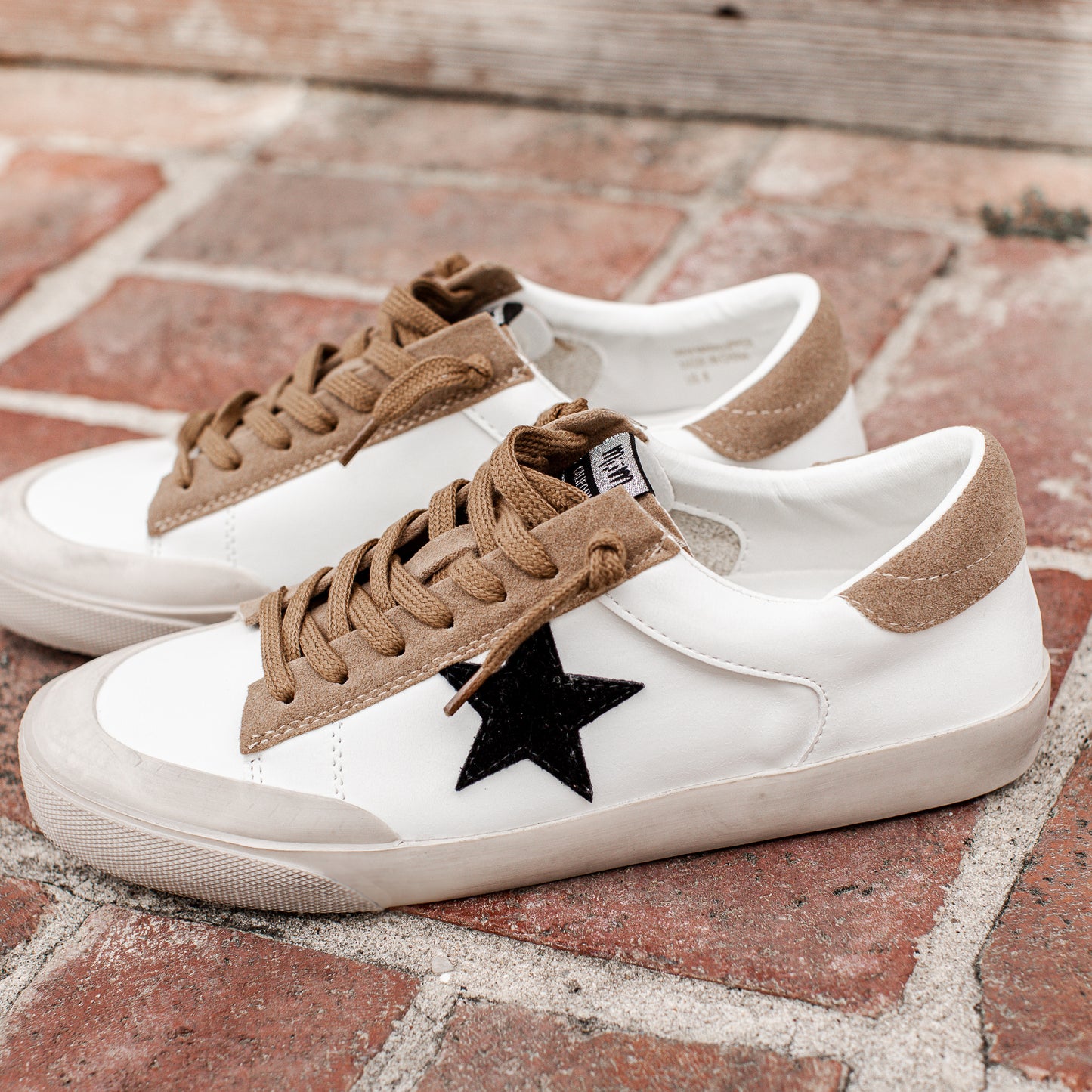 Slip on shoe. Brown suede, white faux leather with a black suede star. SMUDGED SOLE, SOLE IS A TAUPE BEIGE COLOR.