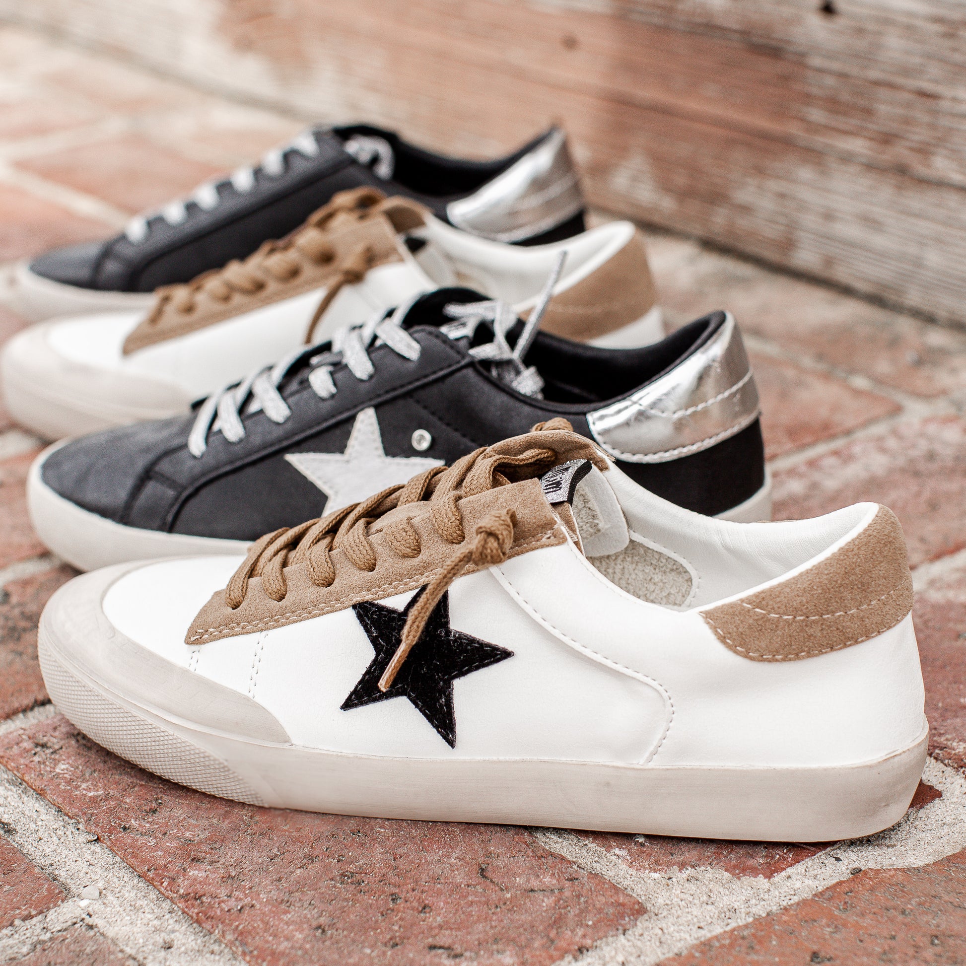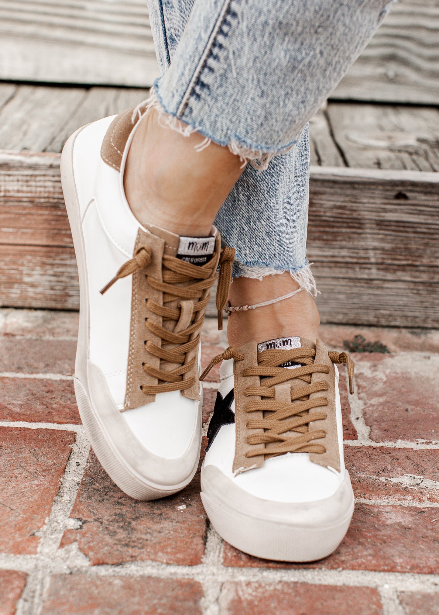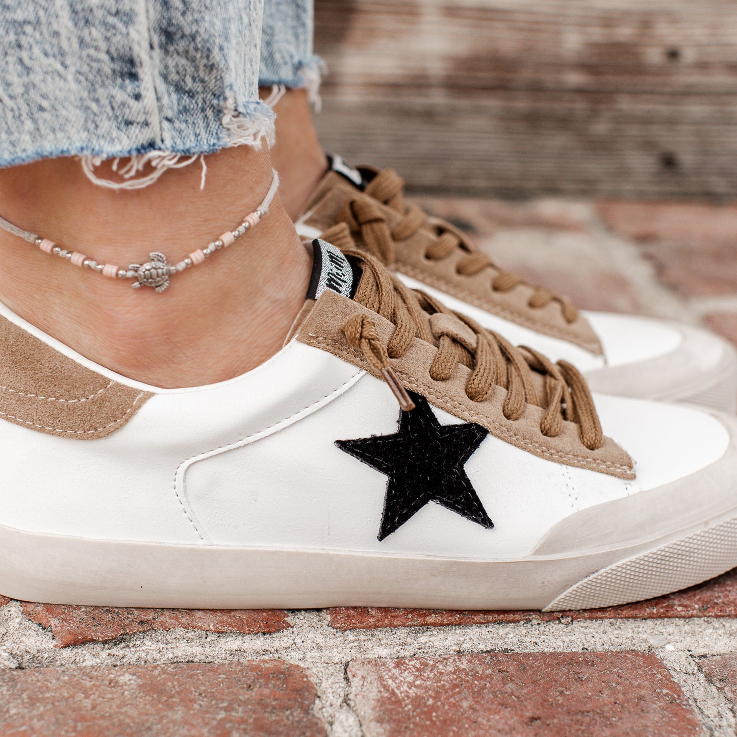 Slip on shoe. Brown suede, white faux leather with a black suede star. SMUDGED SOLE, SOLE IS A TAUPE BEIGE COLOR.