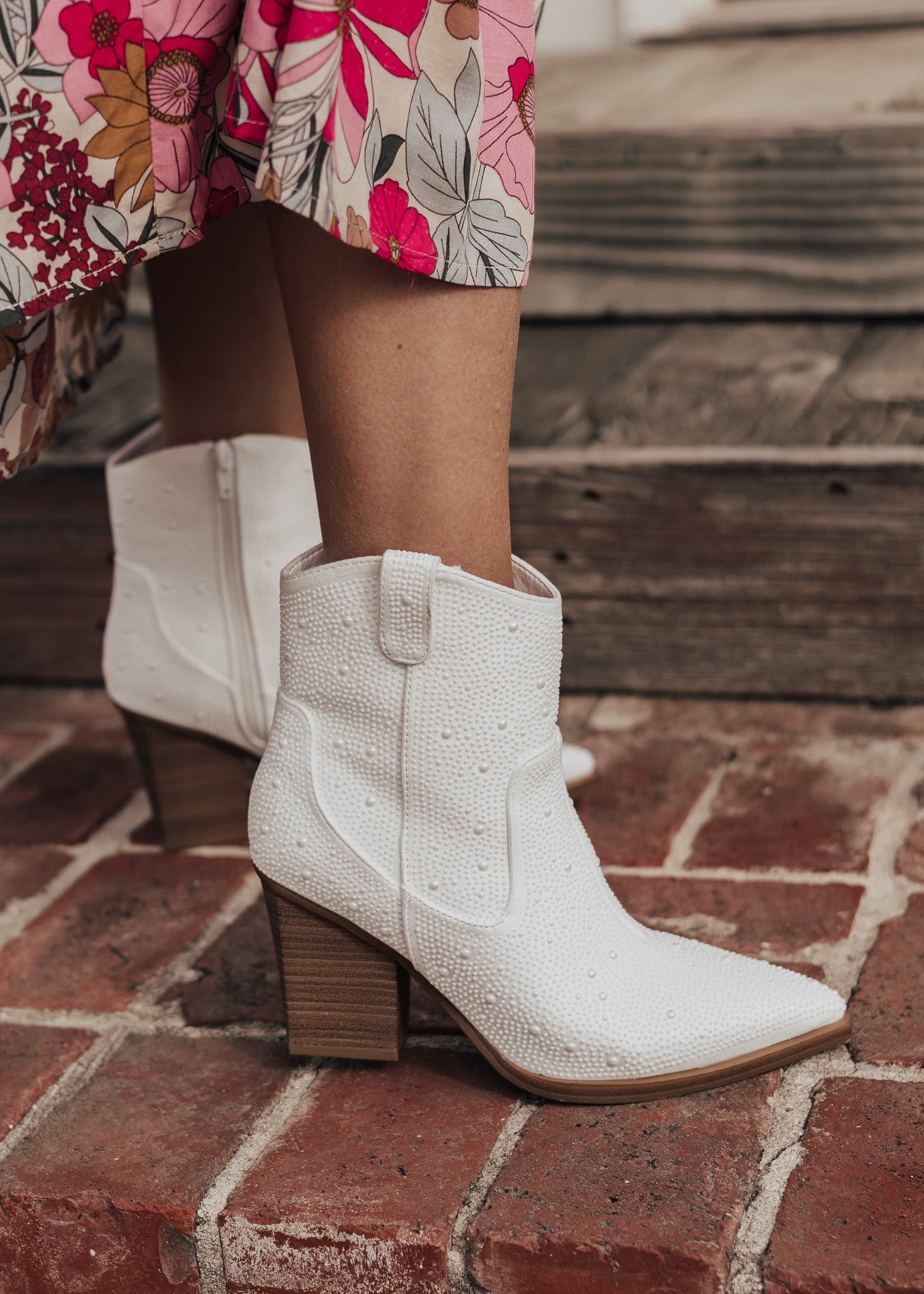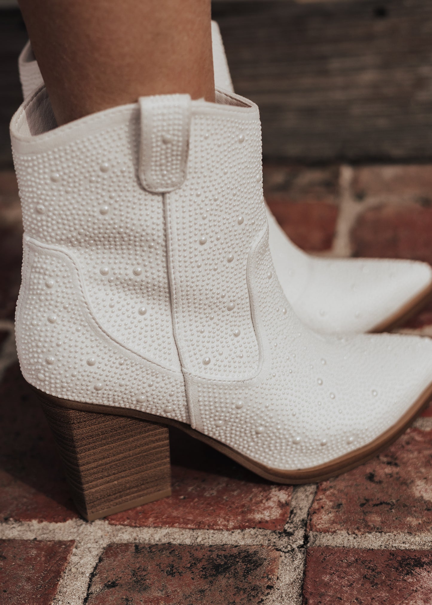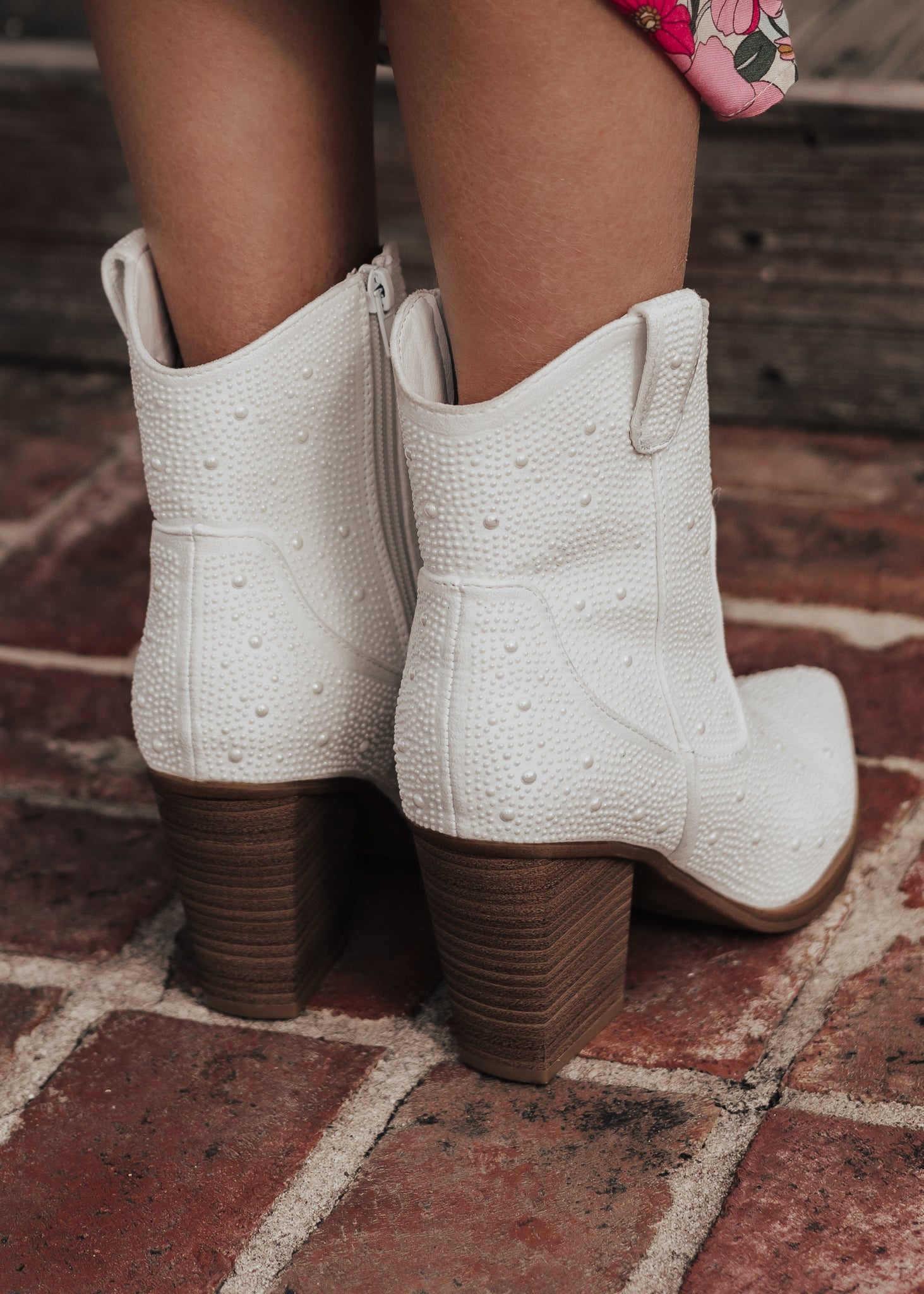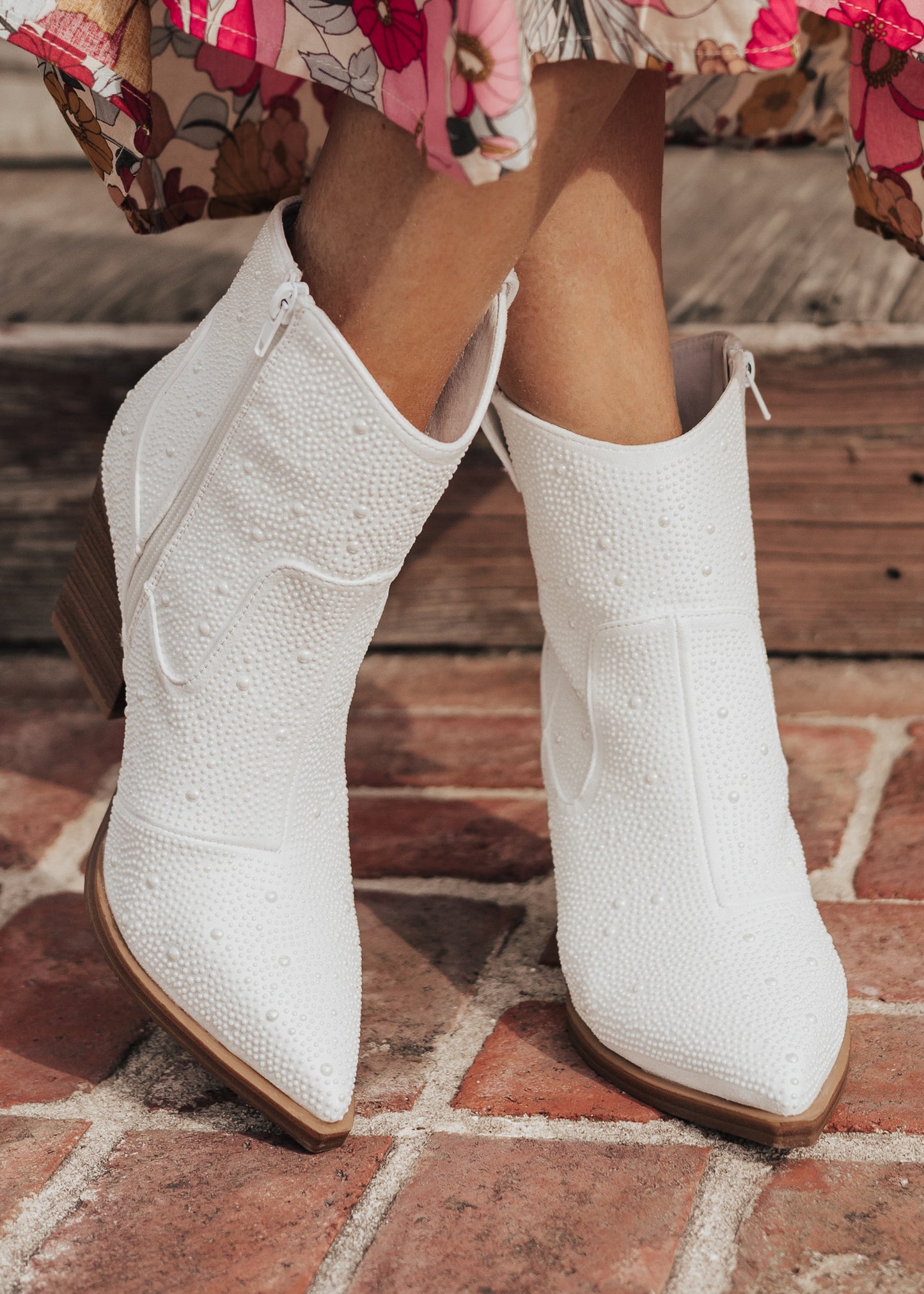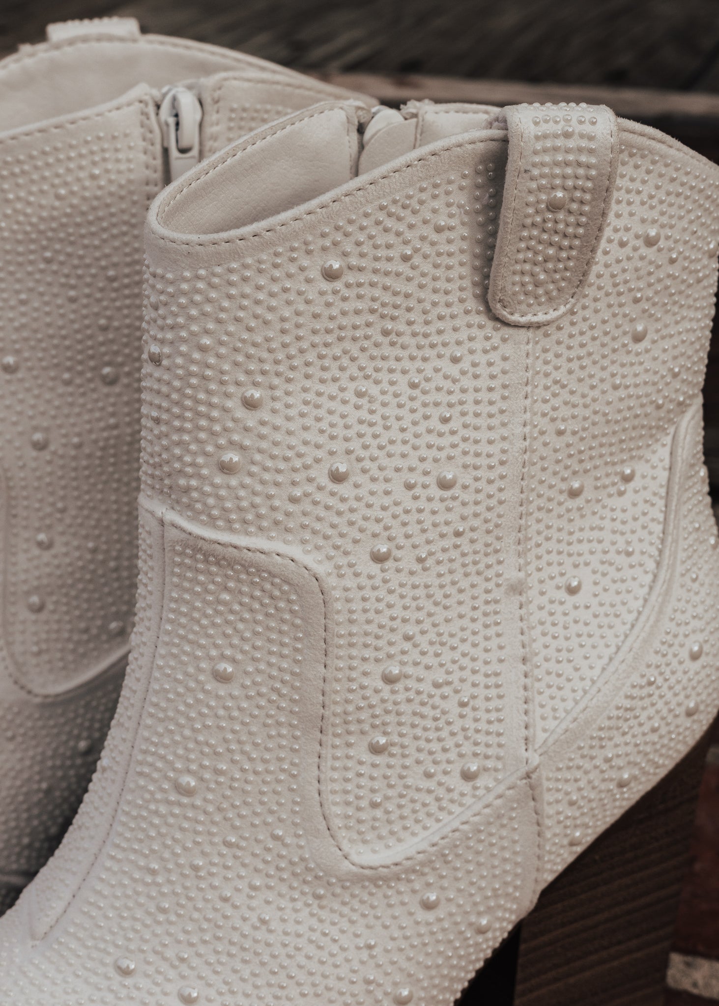 White ankle bootie. Pearl detail. Side zipper. Approx 3in heel.