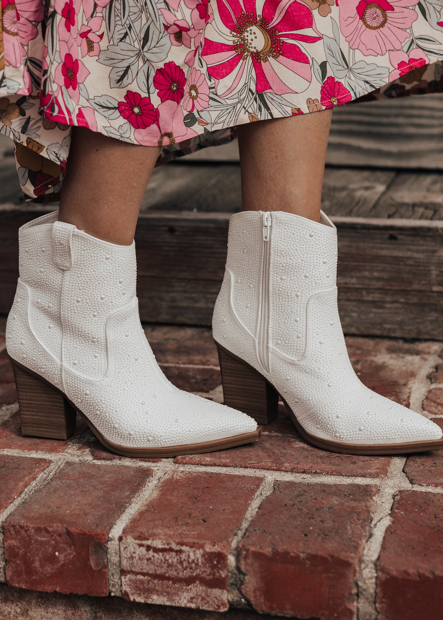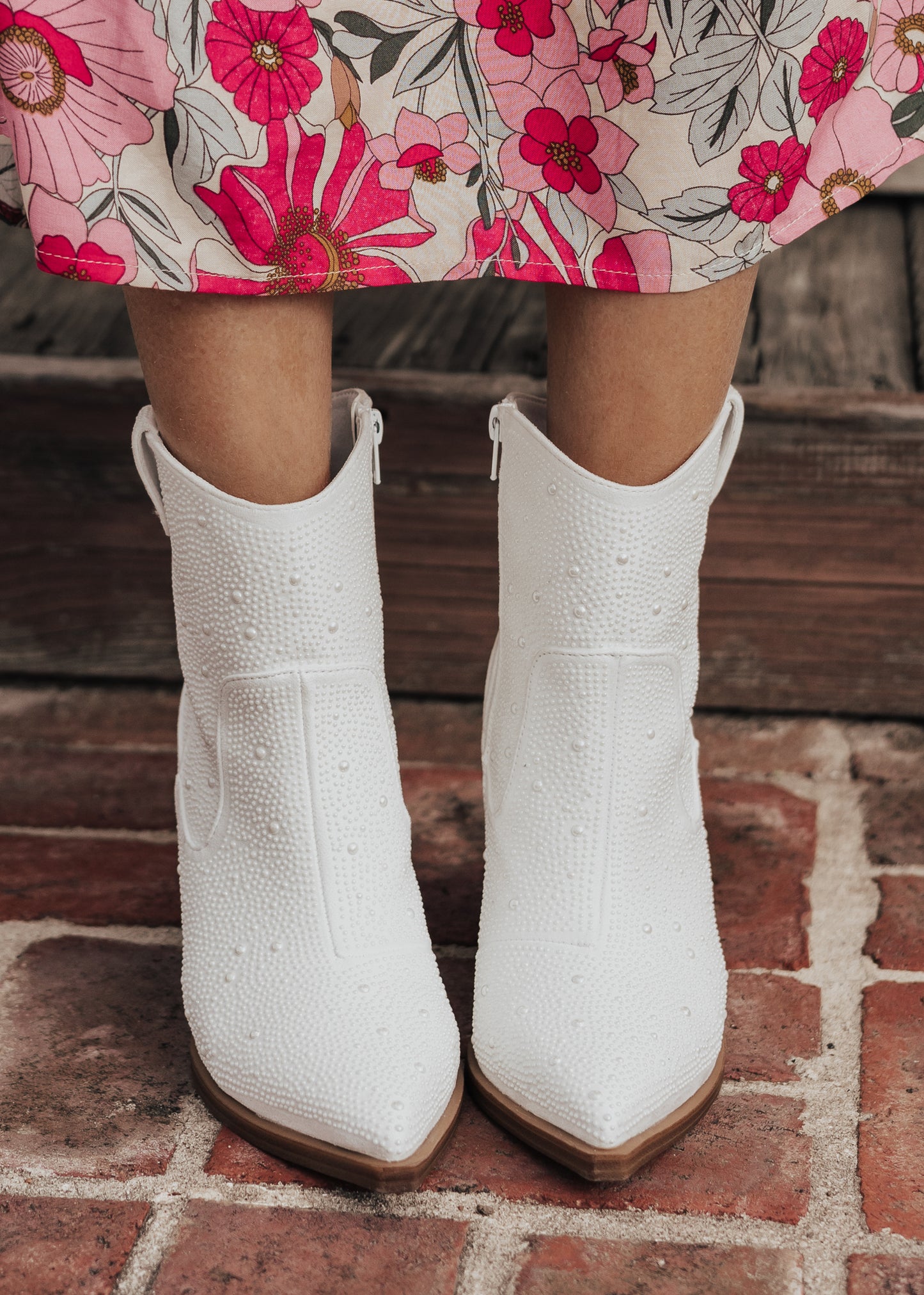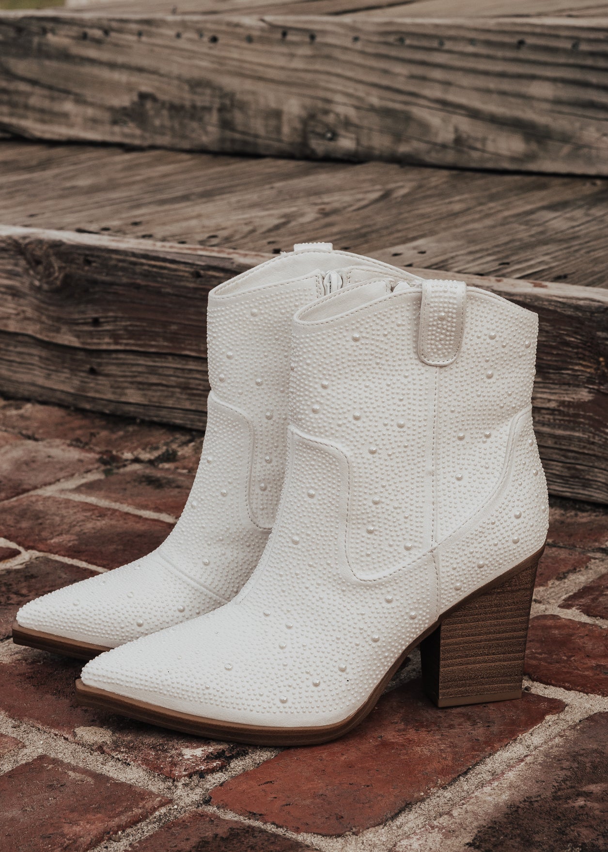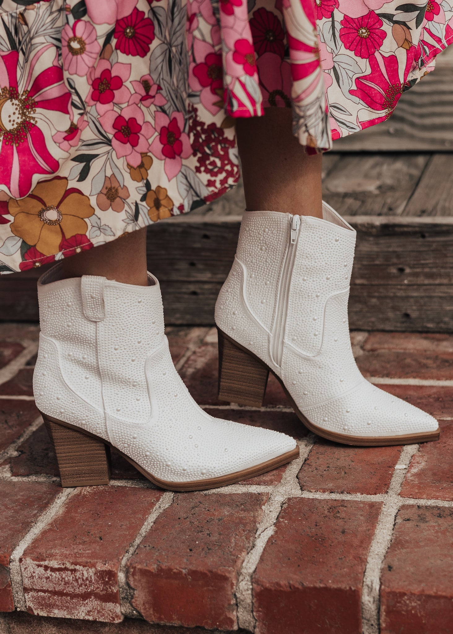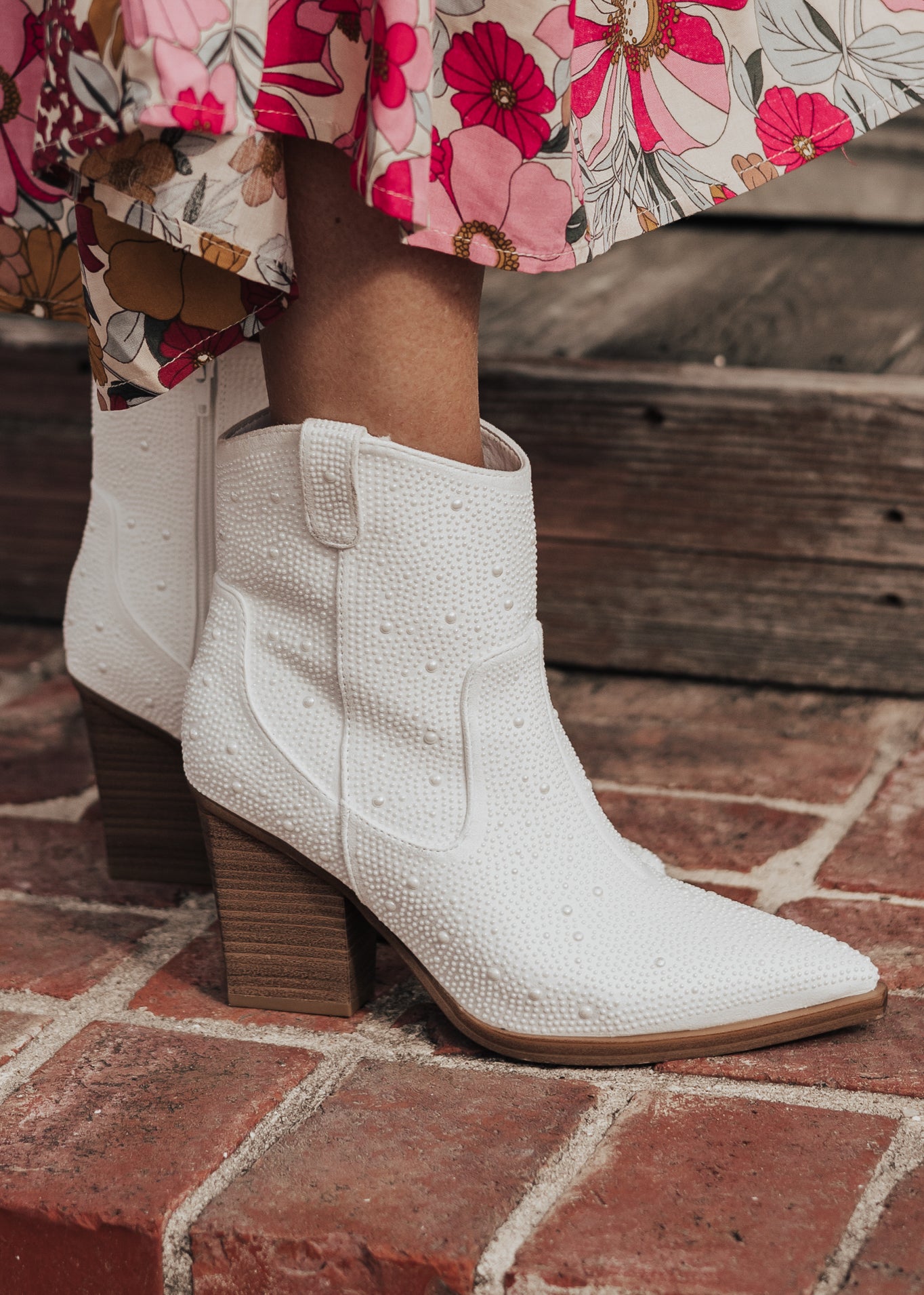 White ankle bootie. Pearl detail. Side zipper. Approx 3in heel.