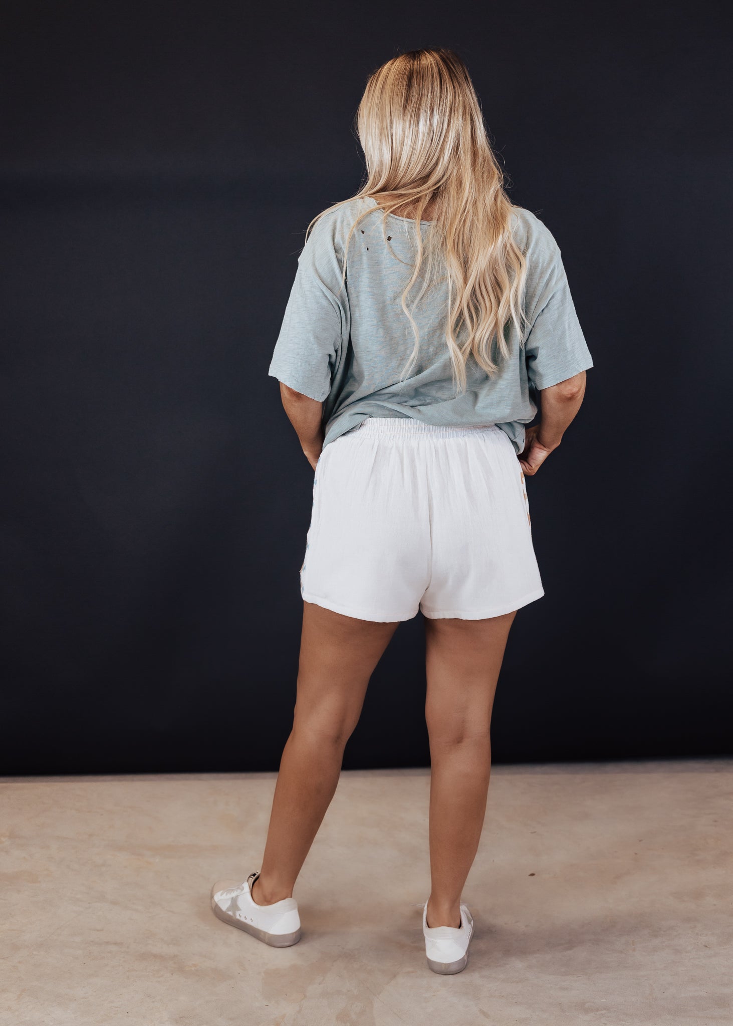 White shorts. Embroidered detail on sides. Has shorts liner. No pockets.