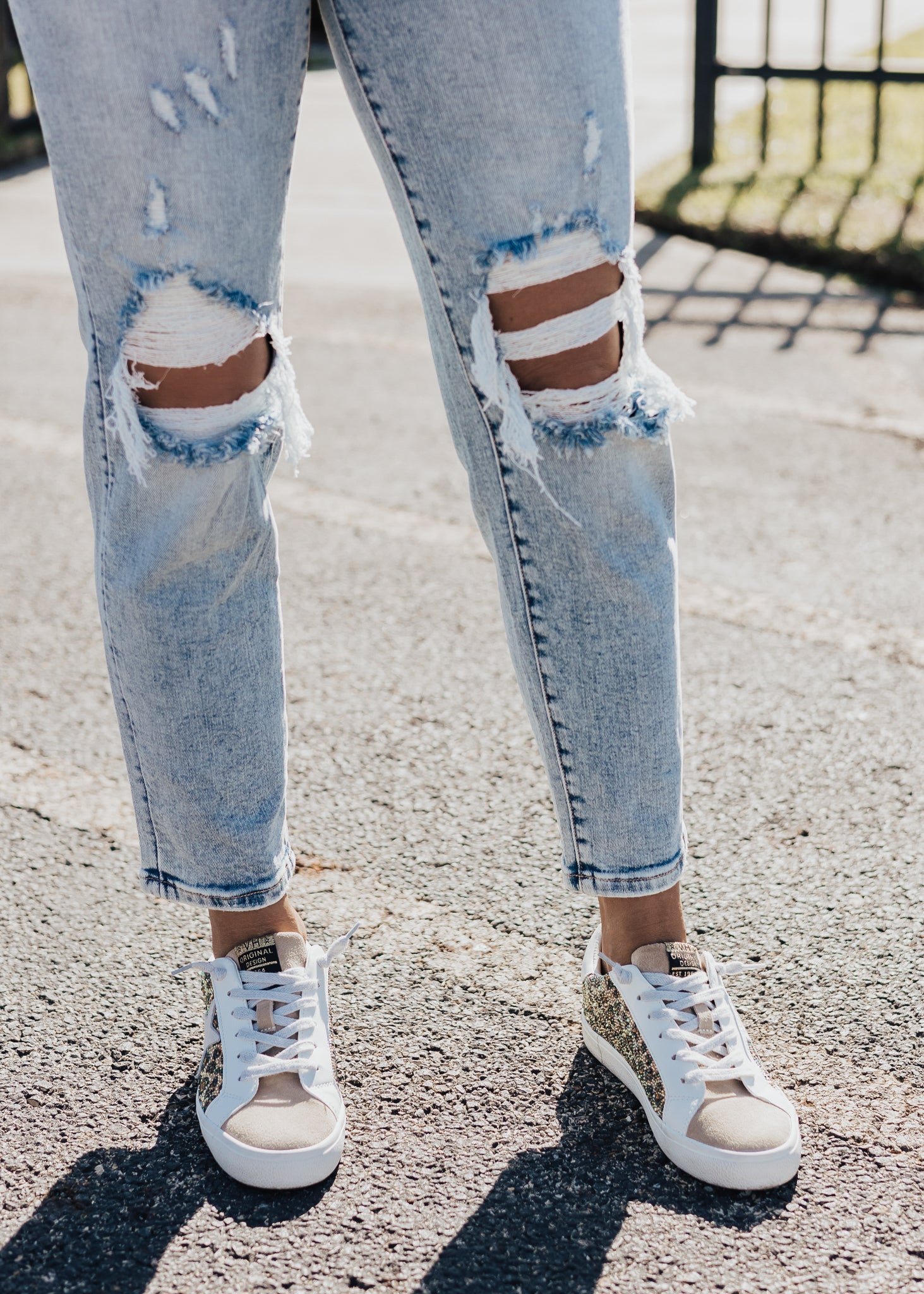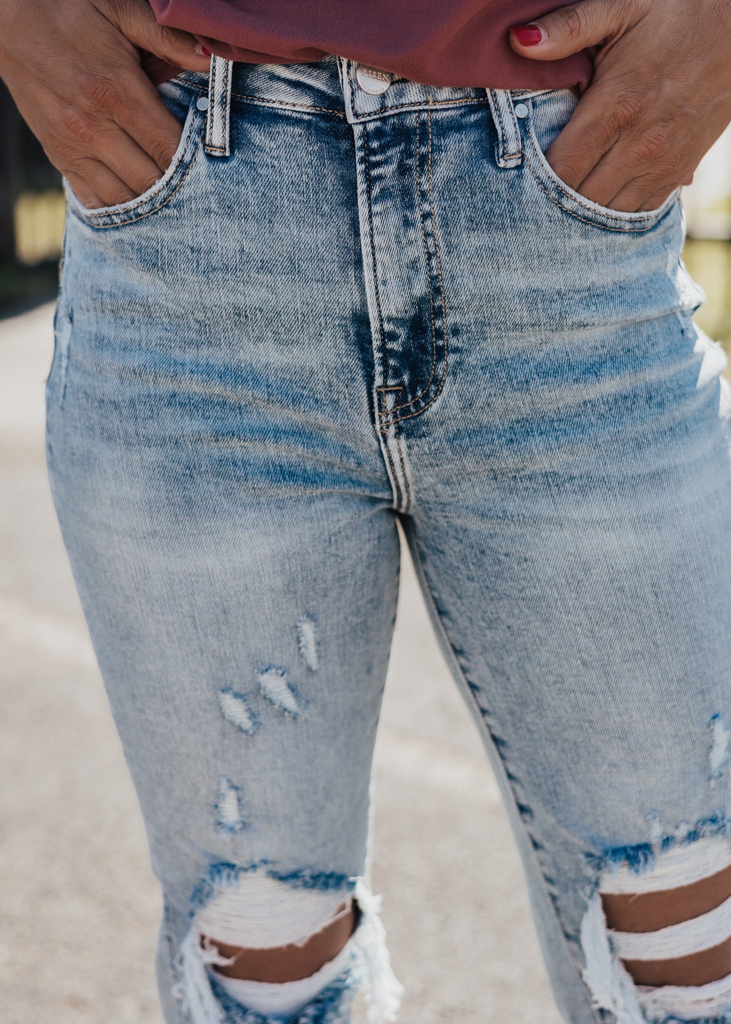 Heavy distressing. High rise, mom fit.