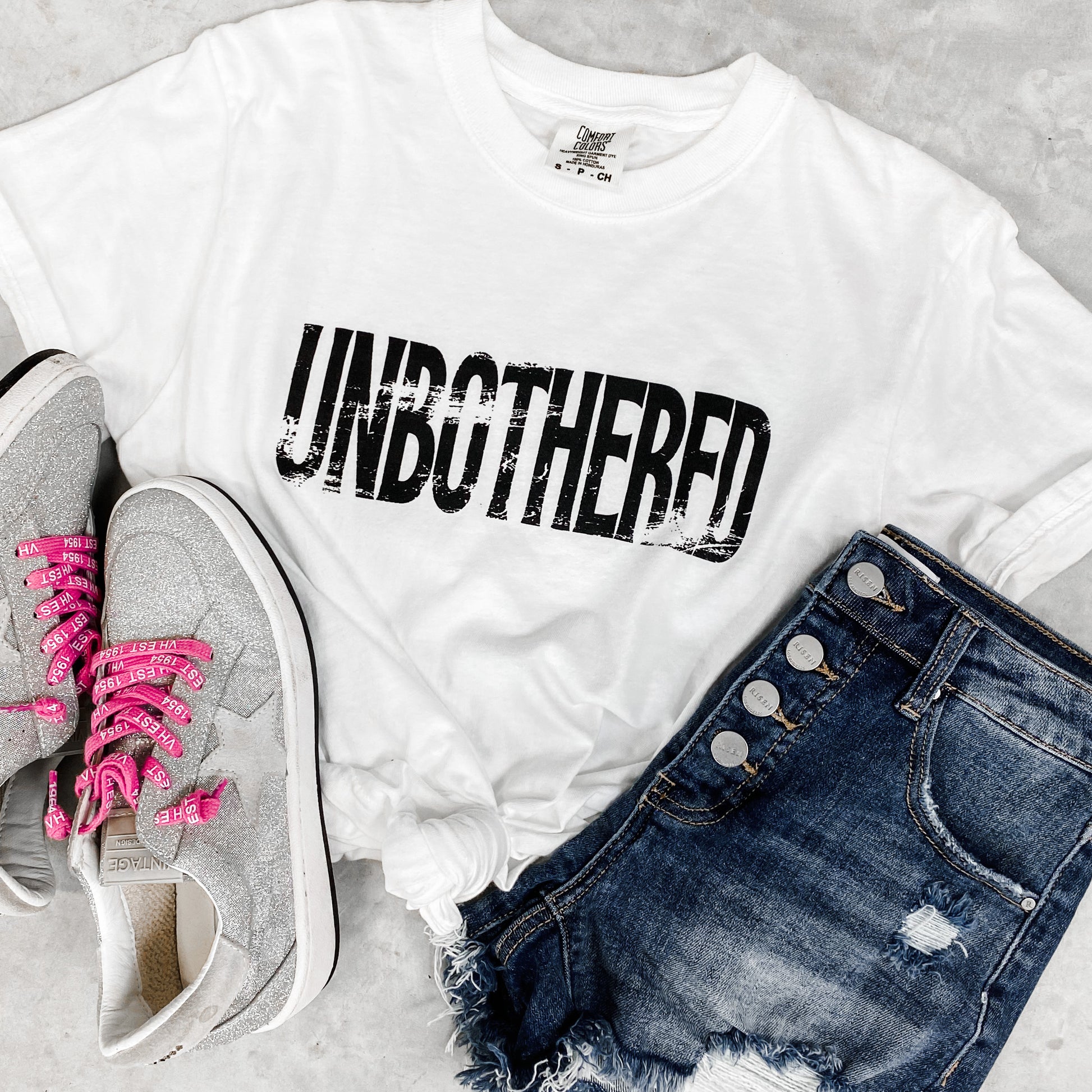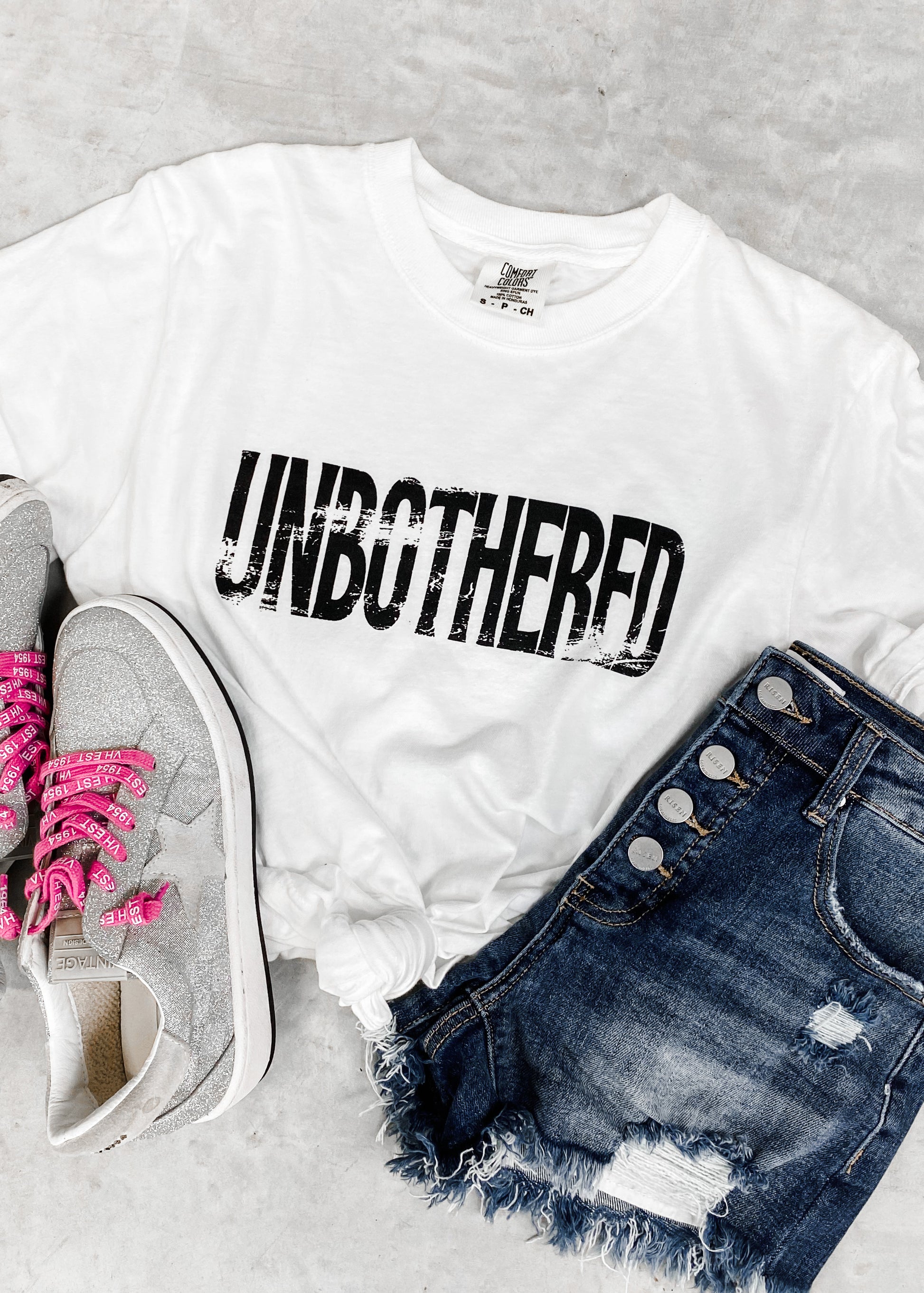 'Unbothered' Screen printed on a WHITE Comfort Colors Tee with Black Ink.