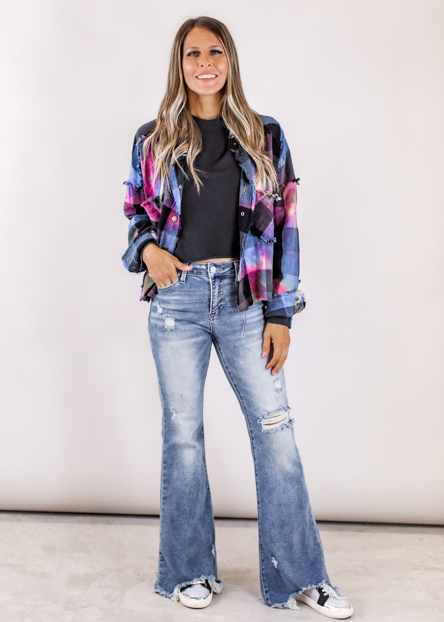 Multi color flannel. Pops of neon colors. Fray detail, Button down. Boxy fit.
